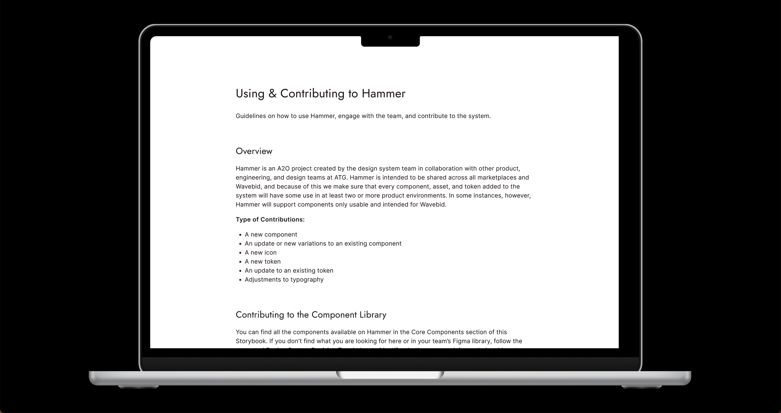 Small but mighty, I worked with one front-end engineer to design, build, and implement the foundations of ATG’s Hammer Design System. We collaborated externally with product teams across ATG, connecting with product designers, engineers, and product managers to understand the needs and requirements of each marketplace. This allowed our team to work swiftly, building a roadmap that met and supported the upcoming needs of each team while simultaneously identifying core system elements to build and iterate along the way.